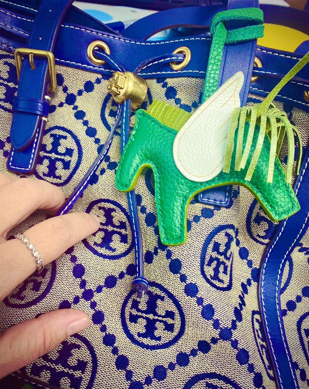 Charm ngựa treo túi với tạo hình chân dài, có đôi cánh trắng như thiên thần.