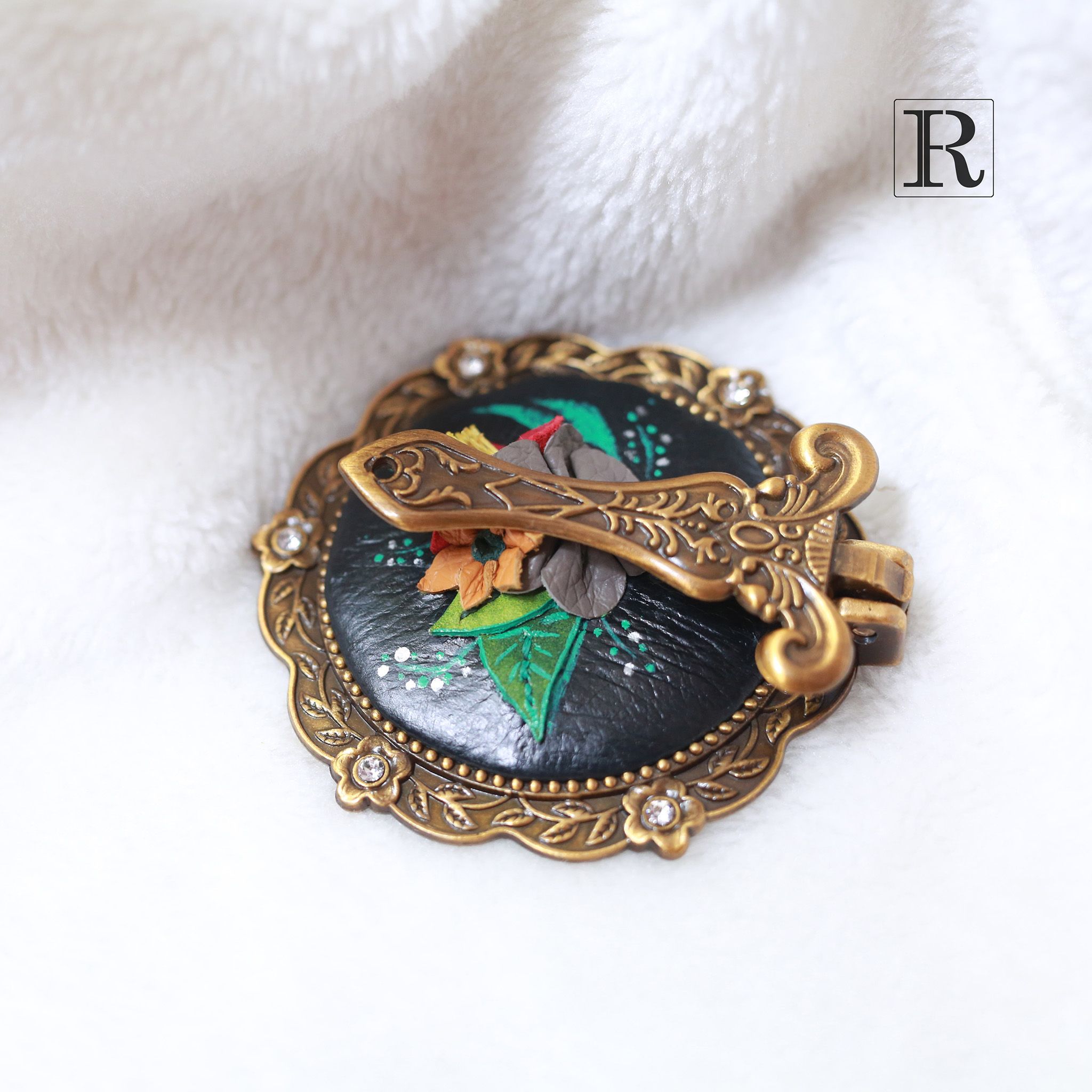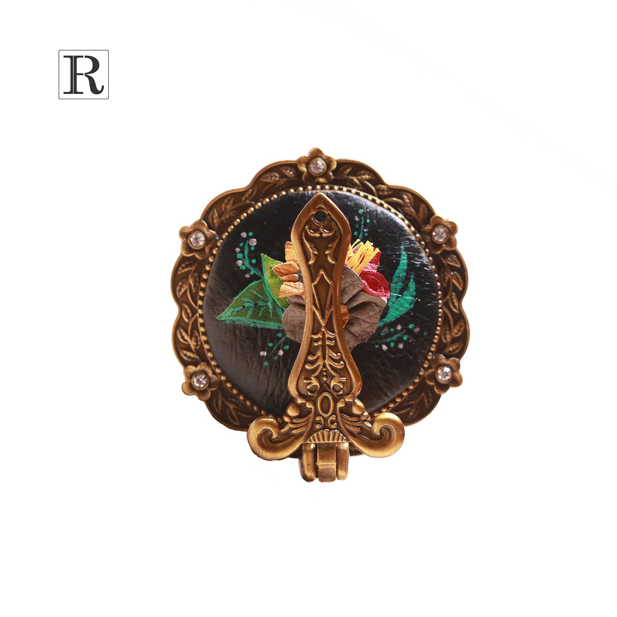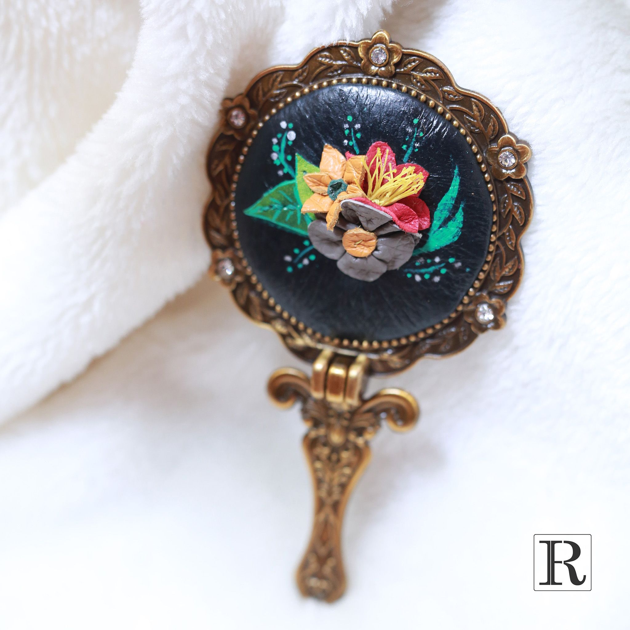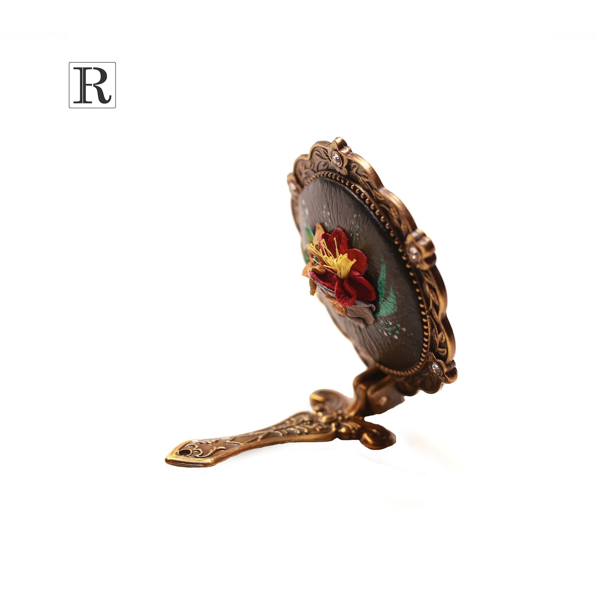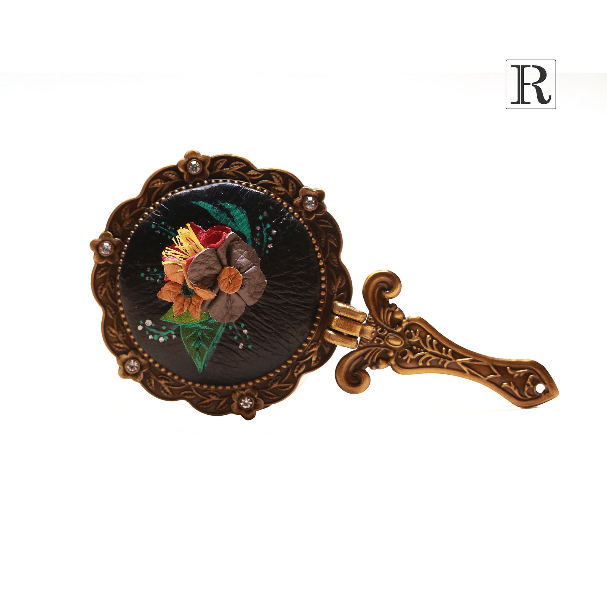 Gương được chế tác thủ công phần ốp lưng bọc da và các họa tiết hoa 3D xinh xắn đầy ngẫu hứng.