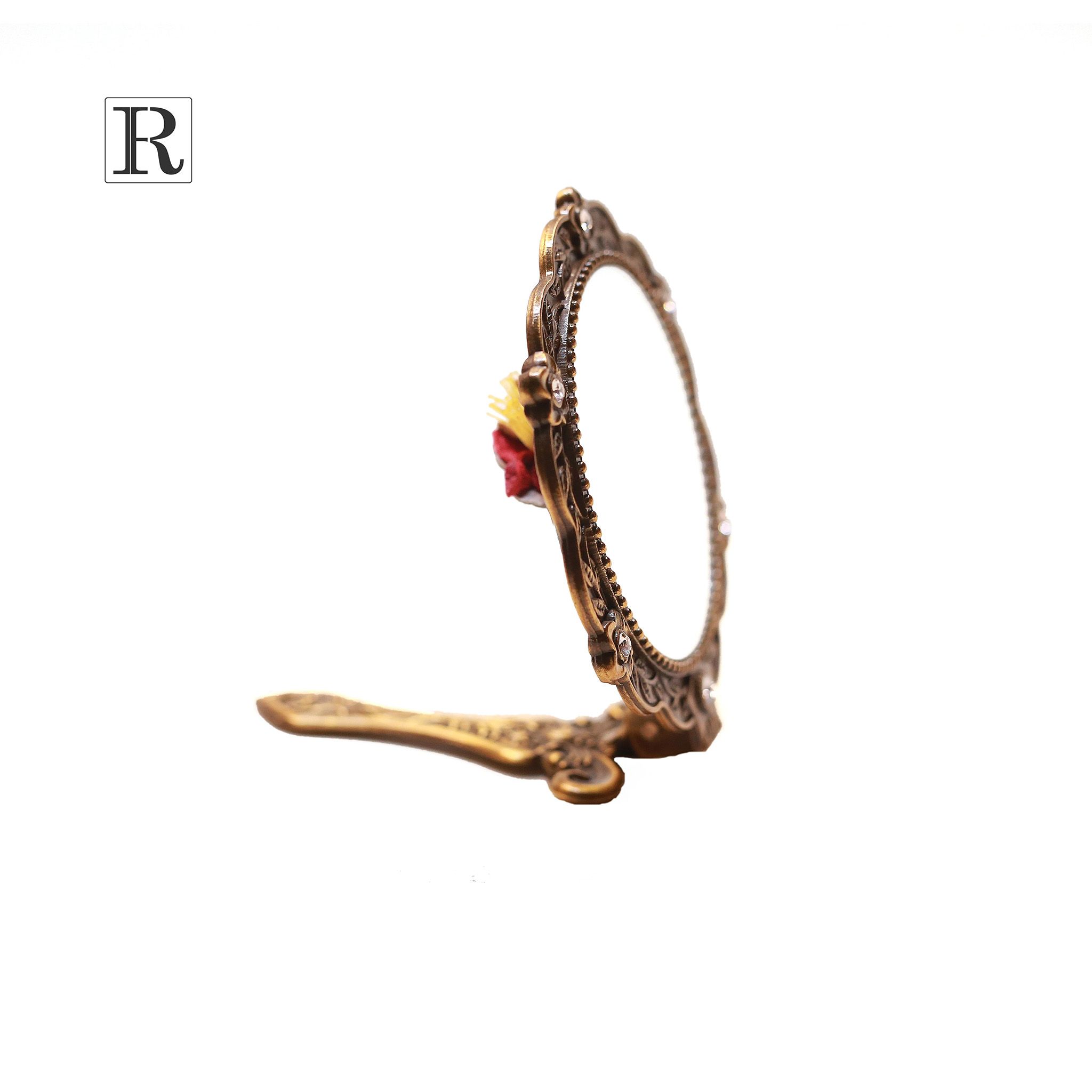 Gương cầm tay có cán có thể gập lên xuống, mặt gương hình tròn, màu đồng.