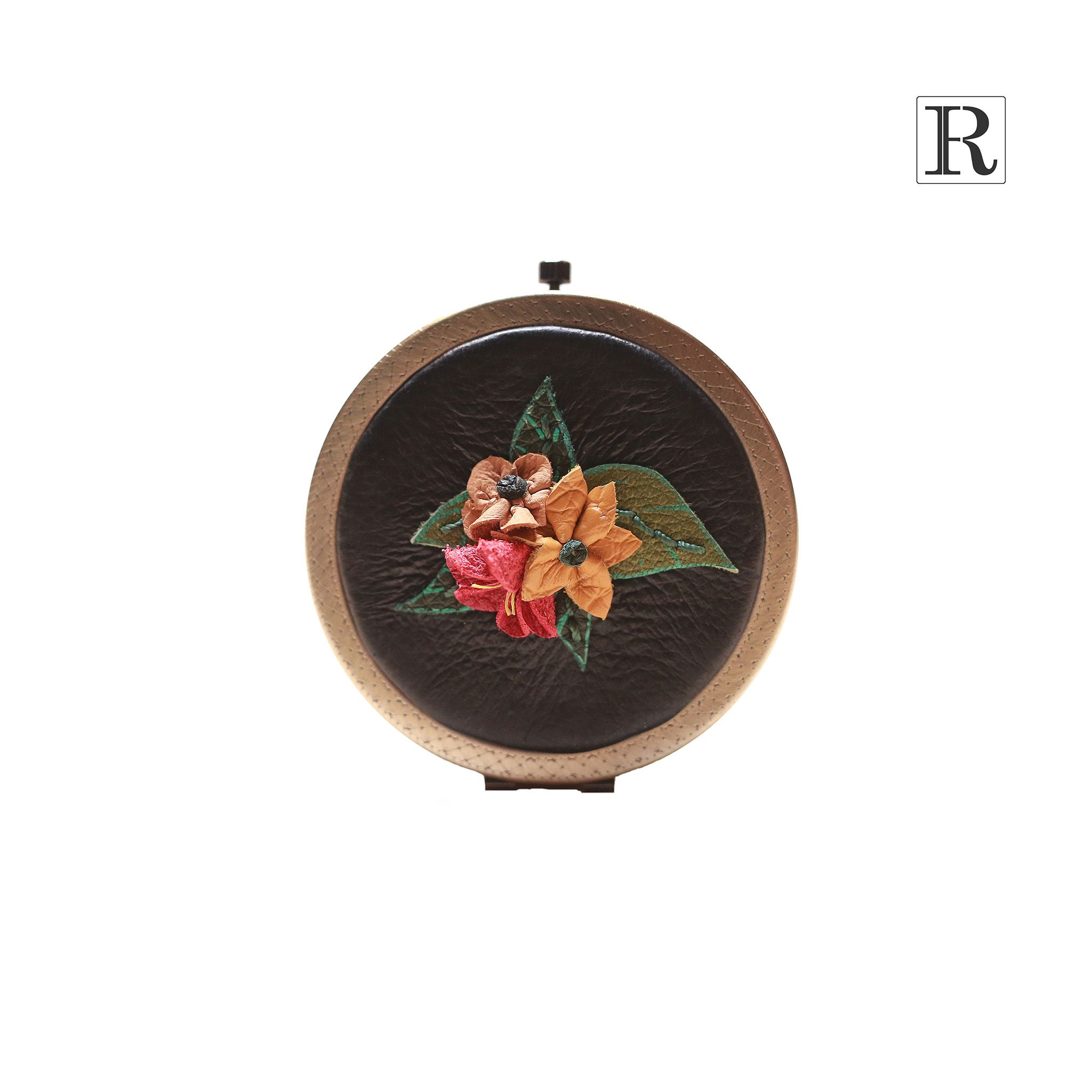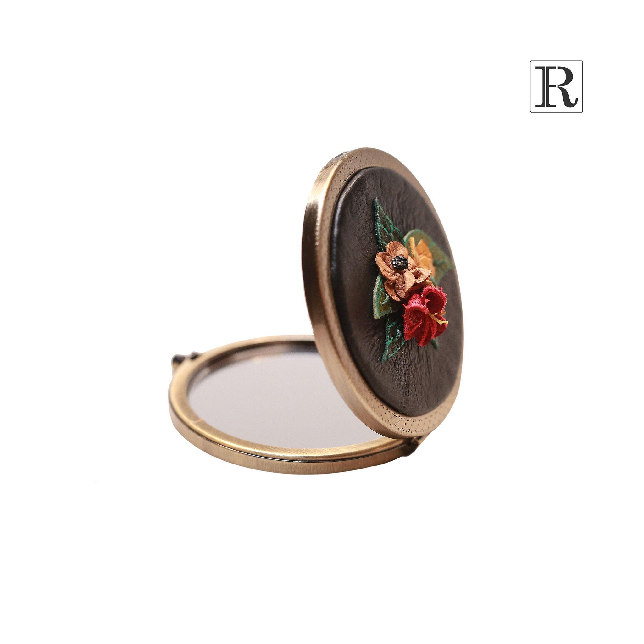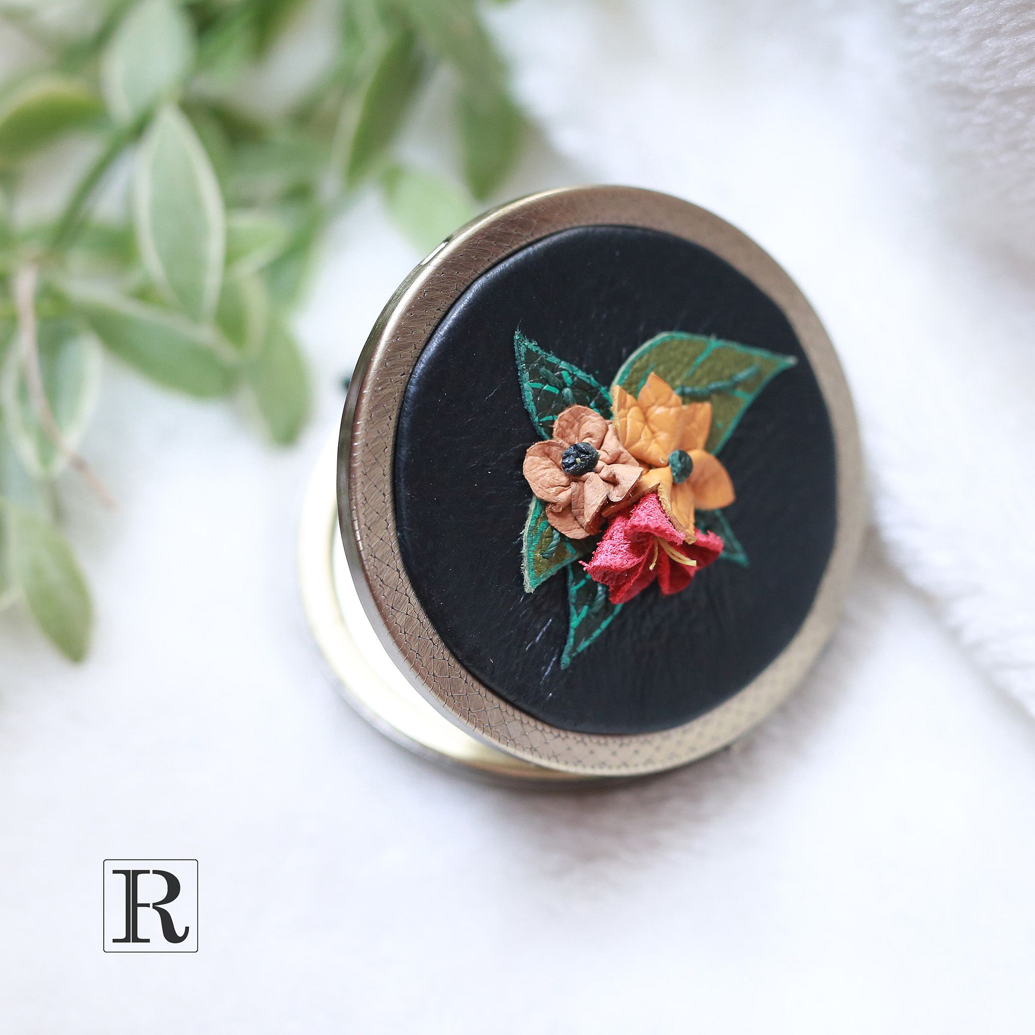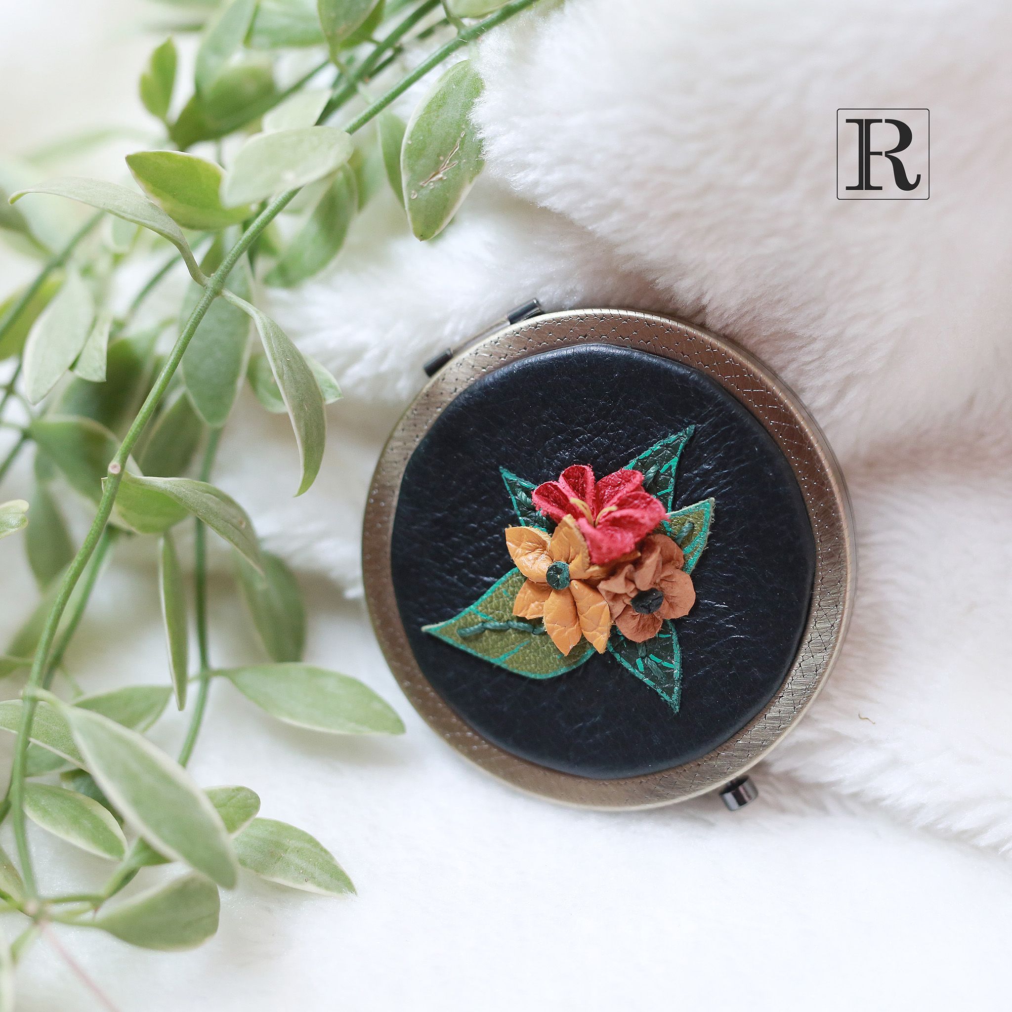 Gương được chế tác thủ công phần ốp lưng bọc da và các họa tiết hoa 3D xinh xắn đầy ngẫu hứng.