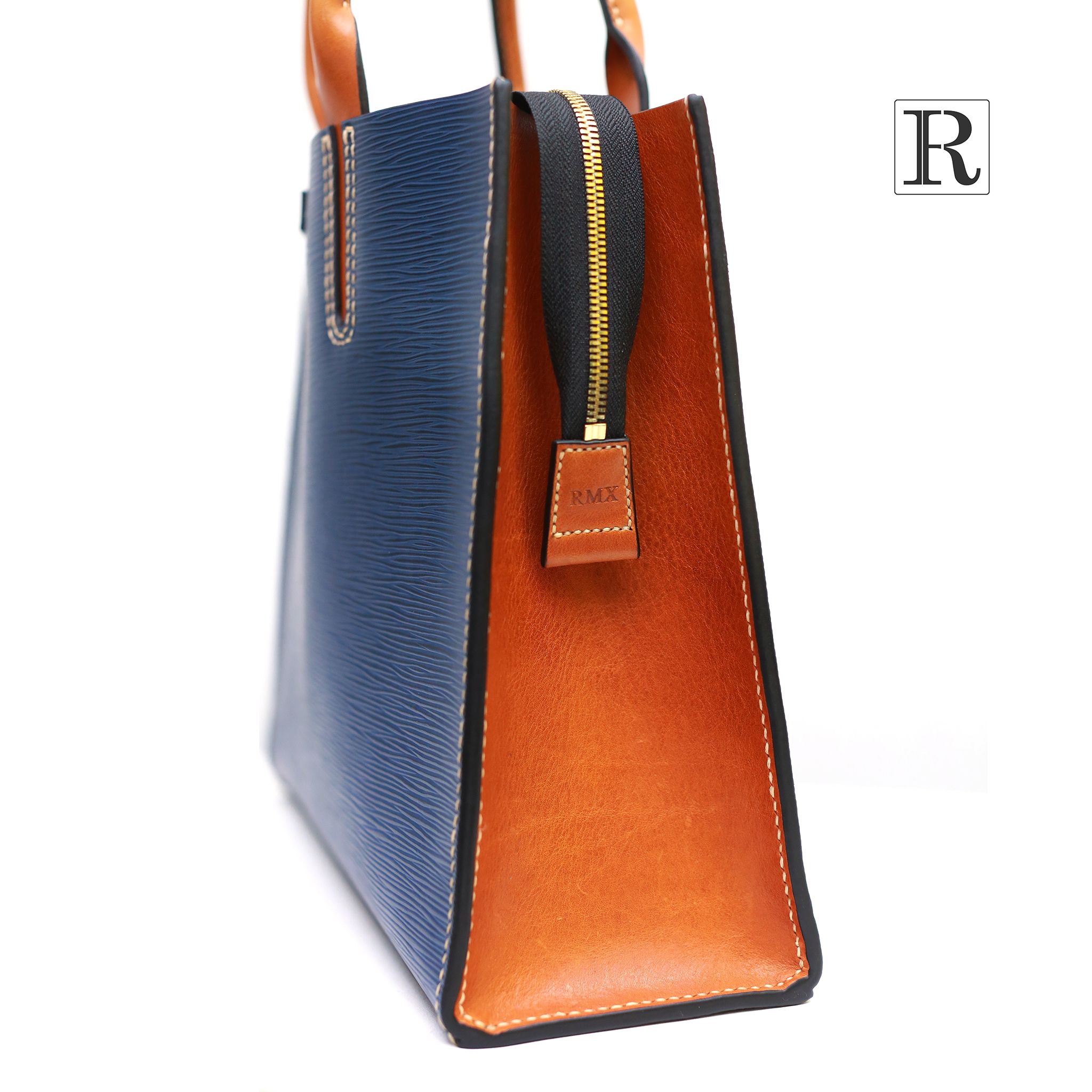 Túi xách công sở với thiết kế đơn giản nhưng tiêu tốn không ít thời gian chế tác thủ công của người thợ. Chất liệu da epi được nhập khẩu từ Ý, với những vân sóng mạnh mẽ, sắc nét được phối phần quai xách và hông túi màu vàng cam da bò mềm mại, tạo nên sự ấn tượng cho sản phẩm tới người dùng